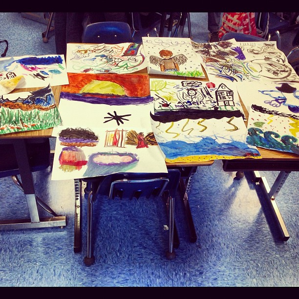 today, in “Short Stories and Snacks” (yes this club exists, yes it’s our @genietorrez brain child) we read “A Very Old Man with Enormous Wings” and painted whatever we “saw” while listening. Then we discussed imagery and ate snacks from Wegman’s. Everyone loved it, everyone participated. This was one of the great days! (Taken with Instagram)
